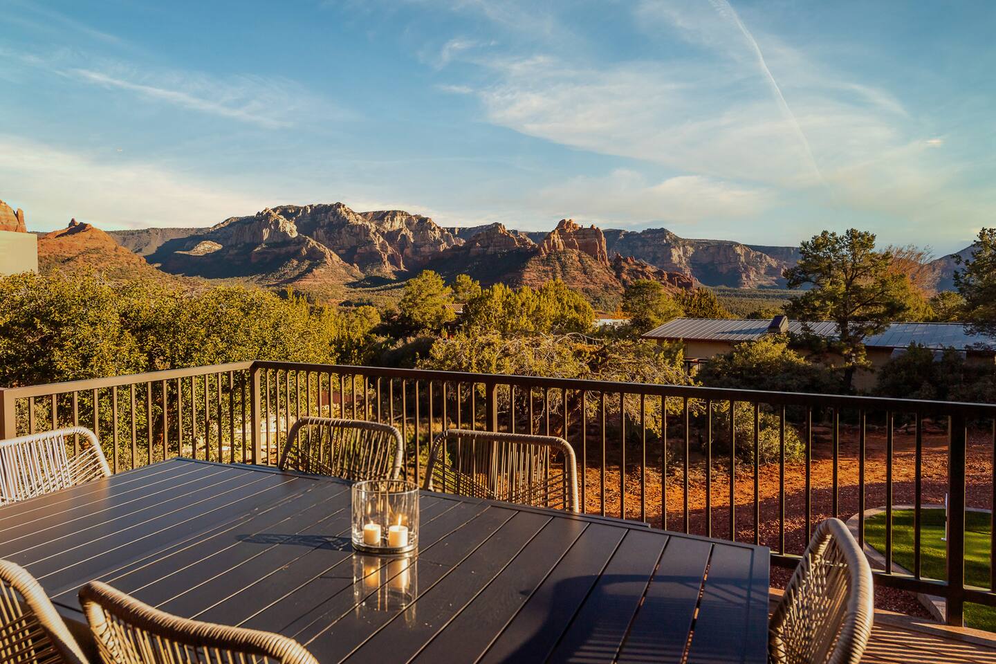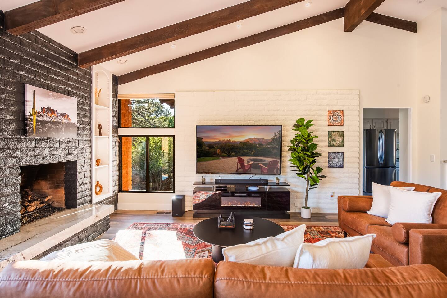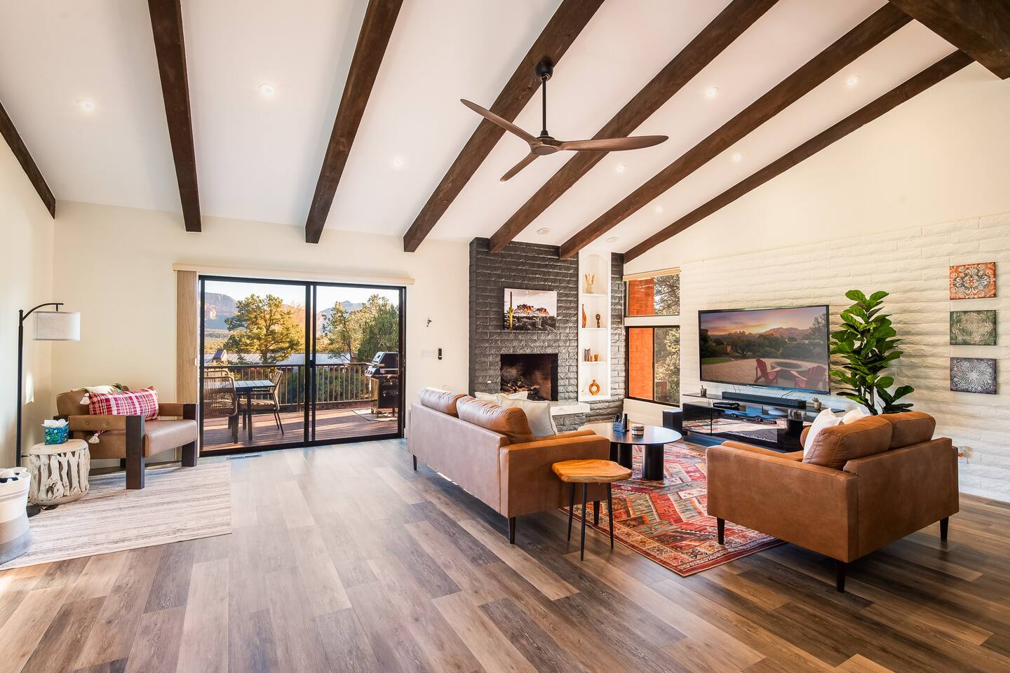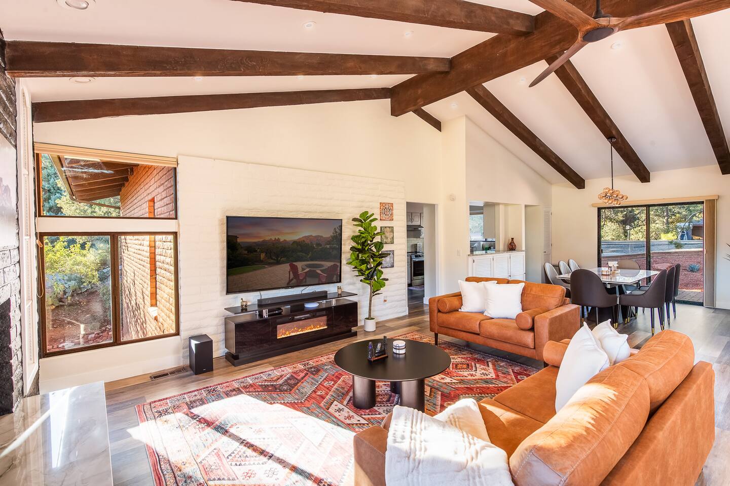 Welcome to your stylish Sedona basecamp perfect for 2 families with older kids! Enjoy jaw-dropping red rock views from nearly every room and the large deck—it's like living inside a postcard! Unwind in the hot tub after hiking, gather around the cozy electric fireplace, and enjoy our large patio with sweeping red rock views. A short walk to Uptown's shops and restaurants. The spacious, stylish decor and amenities ensure comfort in any weather. Come experience Sedona today!